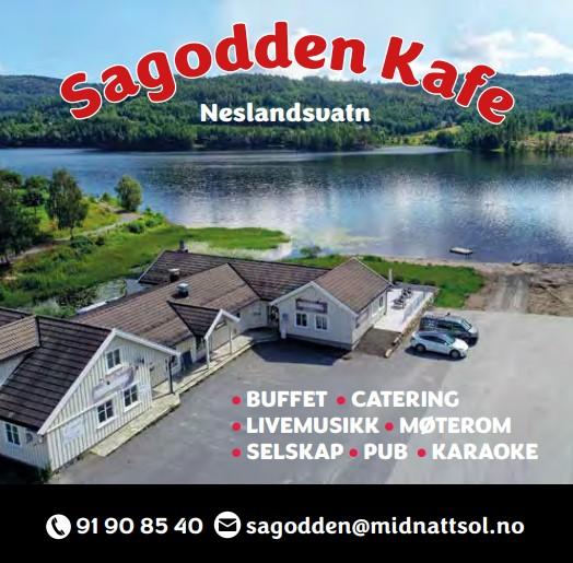 Sagodden Kafe ved Neslandsvanne. Ligger ydyllisk til ved siden av elv som skiller Sagodden i 2 deler. Neslandstunet og sagodden kafe. Med stor parkering for Bobiler, Campingvogner og biler/ busser. Buffet hver Onsdag og Søndag fra Kl 1300. Ellers i Uka ,Meny og Dagens retter. Åpent alle dager fra Kl 1300 Unntatt Mandager ...... Velkommen
