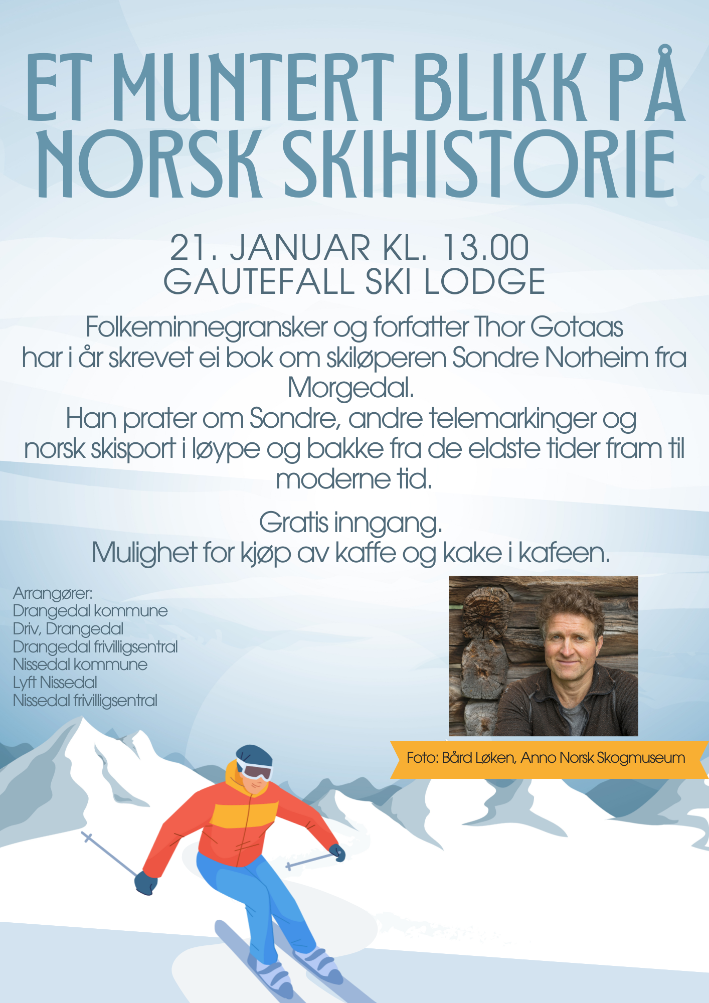 Velkommen til foredrag om norsk skihistorie med folkeminnegransker og forfatter Thor Gotaas. Gratis inngang!Gotaas har i år skrevet nok om skiløperen Sondre Norheim fra Morgedal. Han prater om Sondre, andre telemarkinger og norsk skisport i løype og bakke fra de eldste tider fram til moderne tid.